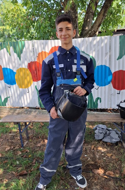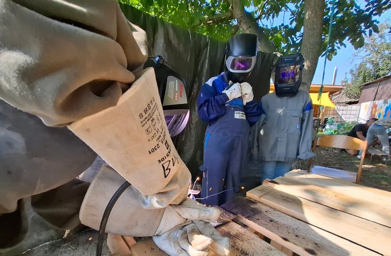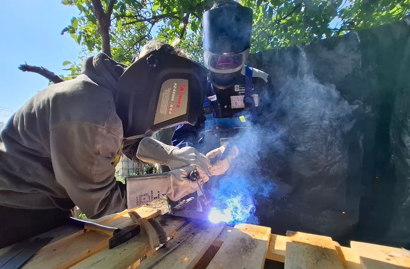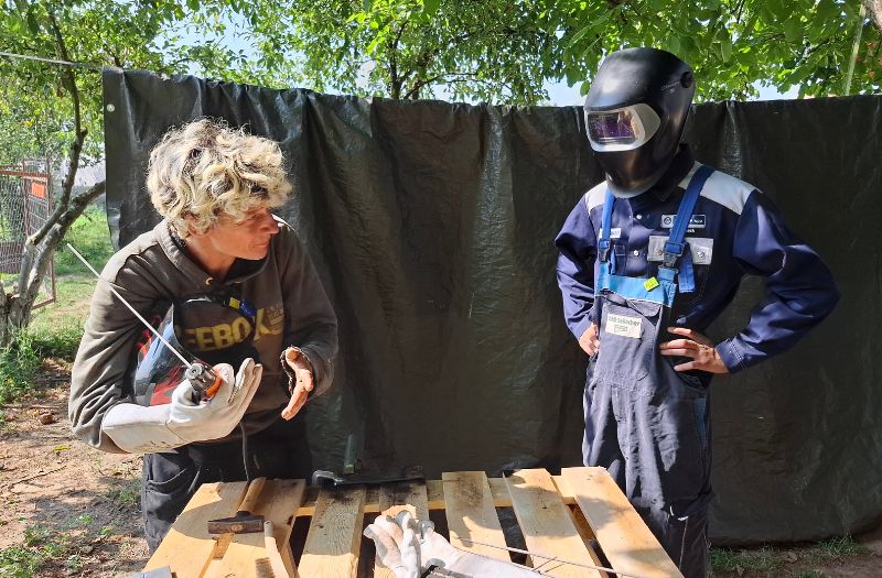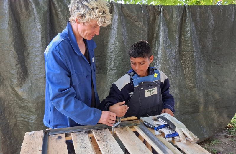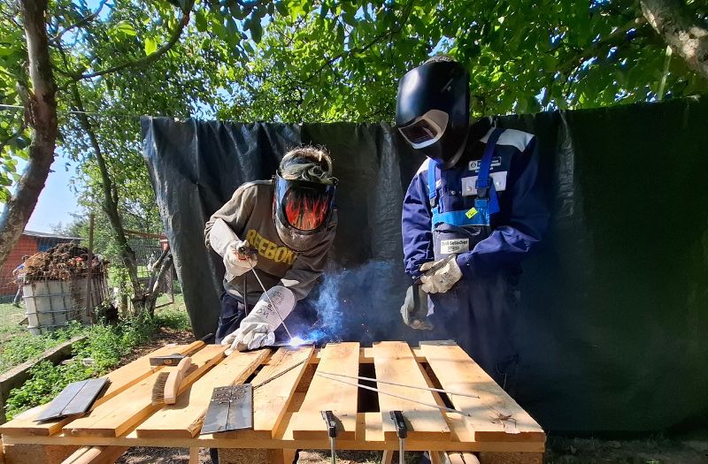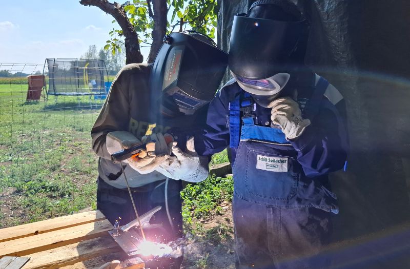 Zunächst sollten die Kinder ihren Namen auf ein Stahlschild schweißen. Im nächsten Schritt werden die Kinder einen Grill für die Feuerstelle zusammenschweißen. Isak und Thomas haben bereits damit begonnen. Das große High-Light wird aber, gemeinsam ein Fußballtor zu schweißen. Darauf freuen sich die Jungs am meisten.