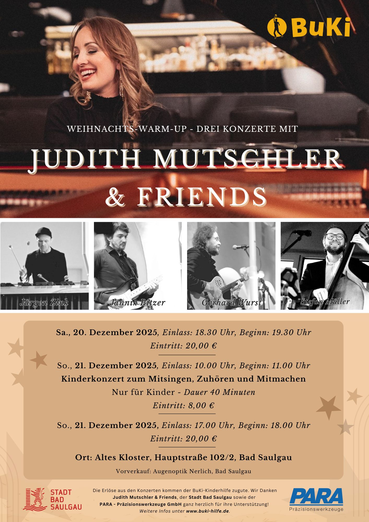 Judith Mutschler, am Piano und am Mikrofon, unterstützt BuKi seit vielen Jahren. Sie freut sich gemeinsam mit ihren Freunden ein großes Weihnachtskonzert für BuKi zu spielen. Jürgen Zink, der Schlagzeuger, sorgt schon seit Jahrzehnten für die richtigen Beats an der Seite der Sängerin. Mit dabei sind Jannik Bitzer und Gerhard „Beefy“ Wurst an den Gitarren sowie Stefan Müller am Kontrabass und Bass.