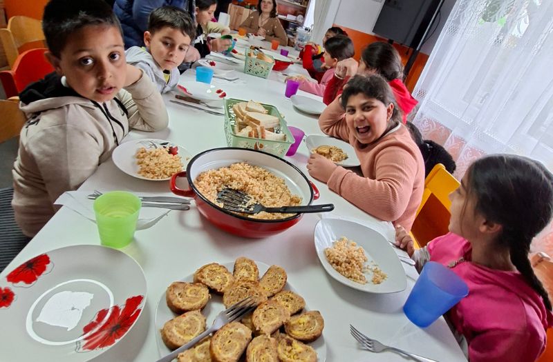 Ein besonderer Moment im BuKi-Haus war der Mittagstisch vor den Osterferien. Edith und Jugendliche aus unserer älteren Gruppe haben typische Osterspeisen vorbereitet. Aufgerolltes Hackfleisch sowie einen süßen Käse zur Nachspeise. Die Krönung an diesem Tag aber war die monatliche Geburtstagstorte, die die Kinder lieben. Und wir alle hatten viel Spaß!